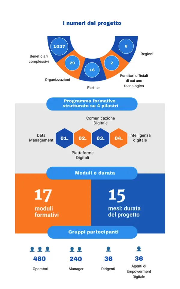 L’iniziativa ha coinvolto una rete ampia di organizzazioni e partner distribuiti su più territori, costruendo un ecosistema collaborativo capace di mettere in connessione competenze, esperienze e bisogni concreti. In quindici mesi di attività, il progetto ha raggiunto oltre mille beneficiari tra operatori, manager, dirigenti e figure dedicate all’empowerment digitale, attivando un percorso multilivello e integrato.